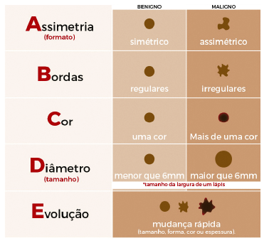 A regra do ABCDE auxilia no diagnóstico precoce de lesões suspeitas de câncer de pele. Observe os seguintes pontos: