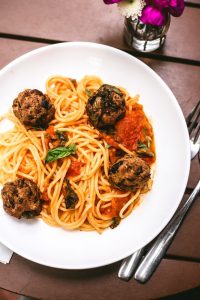 Em uma frigideira, doure o alho e a cebola. Acrescente os tomates. Quando estiver cozido, adicione o manjericão e desligue. Cozinhe o espaguete sem glúten ou grano duro integral conforme as informações da caixa. Adicione o molho e as almôndegas e pronto!