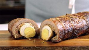Abrir o matambre, temperar com sal, pimenta-do-reino, alho amassado e pincelar a mostarda. Dispor as fatias de bacon e cobrir com queijo parmesão. Polvilhar a farinha de rosca e a salsinha. Dispor os ovos cozidos. Enrolar o matambre cuidadosamente. Amarrar com um barbante. Cobrir bem com papel alumínio. Levar ao forno preaquecido a 180 graus centígrados por 2 horas. Retirar o papel alumínio e voltar ao forno por mais 30 minutos para dourar.